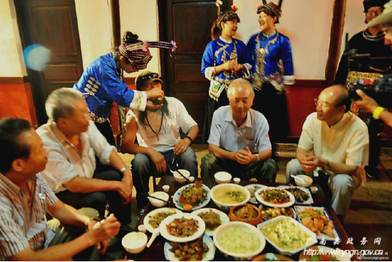 西行音樂公路之旅行至廣南,當地企業(yè)為讓旅行團隊充分了解廣南的飲食文化及人文風俗,經過多方走訪,把廣南土司后代、地主大戶后代等曾經享受過土司盛宴的老人集在一起,共同研究,精心準備,聘請當地名廚,制作出消失48年之久的土司盛宴——“三滴水”。